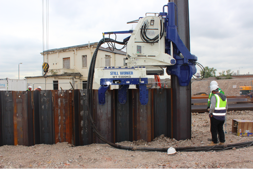 The River Terrace Gravels were loosened by pre-augering in advance of the sheet pile installation. This was carried out with a 400mm diameter auger fitted to a Bauer RTG16T leader rig. The sheet piles were then driven to level using two Kowan StillWorker WP150 “Silent & Vibration-Free” pile presses, to meet Barratt London’s required program.